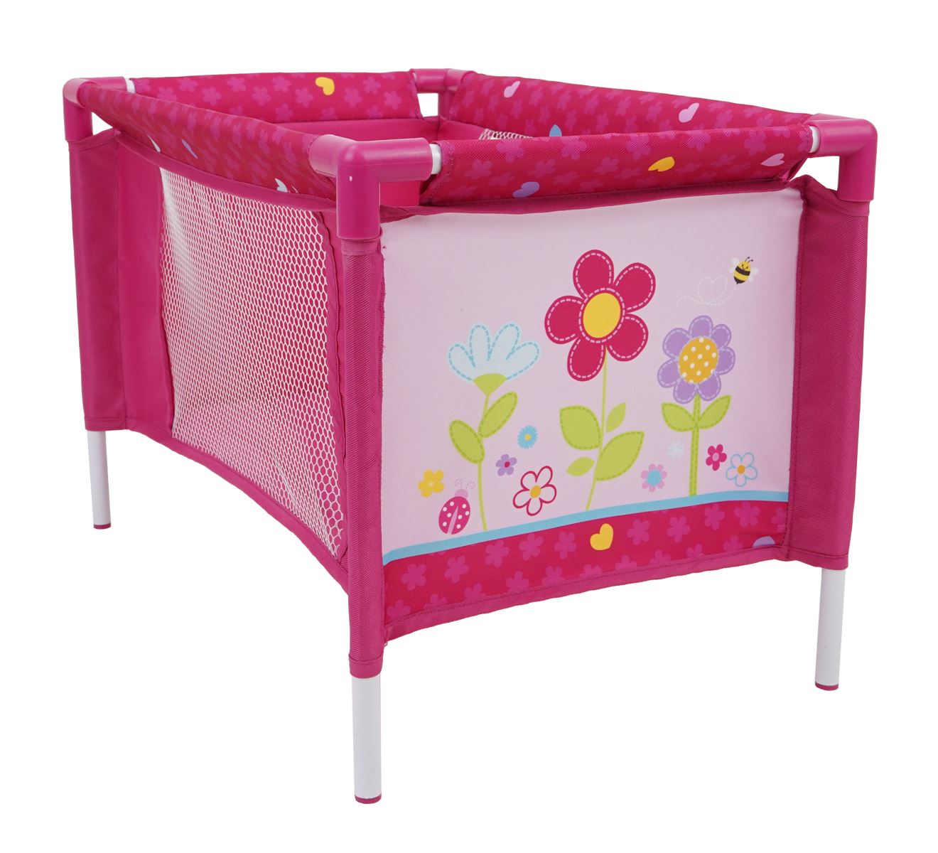סט משחק מקיף המאפשר לילדים לדמות טיפול בתינוק בובה, כולל עריסה לשינה, טיולון לטיולים וכיסא אוכל להאכלה. הסט מעוצב בצבעי ורוד עזים עם דוגמאות פרחוניות ודבורים, המתאימים למשחק ילדים