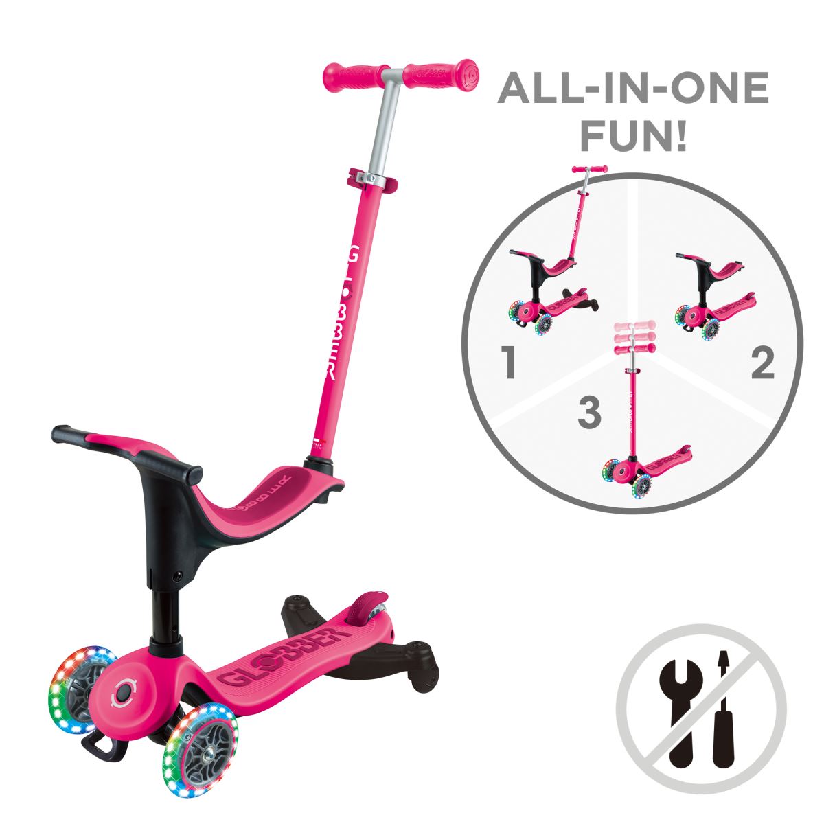 קורקינט 3 ב-1 עם אורות LED ושליטת הורה. מוצר אחד – 3 שלבים של גדילה! הכירו את GO UP SPORTY LIGHTS 360° – קורקינט חכם שמתאים את עצמו להתפתחות הילד, משלב דחיפה, ישיבה ורכיבה עצמאית.